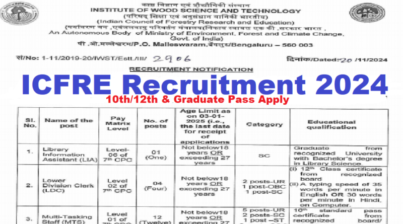 ICFRE Recruitment 2024 ,10th,12th, Gradaute Latest Vacancy 2024, 03/01/2025 Last Date