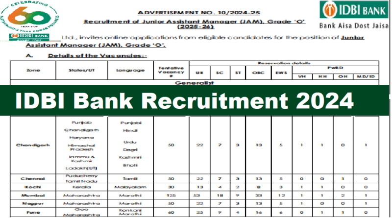 IDBI Bank Recruitment Zone, State & Vacancy 2024