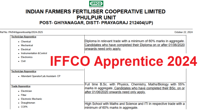 IFFCO Phulpur Apprentice Recruitment 2024, ITI, Diploma, B.Sc latest vacancy 2024