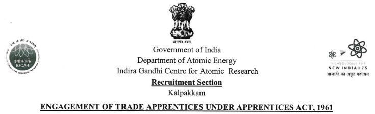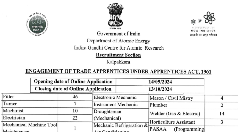 IGCAR Apprentice Recruitment 2024 : Indira Gandhi Centre for Atomic Research (IGCAR), a Research and Development Centre under the Department of Atomic Energy, Government of India is inviting applications through online portal for the engagement of ITI Trade apprentices under the Apprentices Act-1961 and amendments made time to time in the following trades / disciplines. IGCAR Apprentice Recruitment 2024 Online form apply from 14-09-2024. IGCAR Apprentice Recruitment 2024 Online form apply before 13-10-2024. IGCAR Apprentice 2024 for ITI Pass Fitter Turner Machinist, Machinist (Grinder) Electrician, Wireman Mechanical Maintenance Machine Tool Electronic Mechanic Instrument Mechanic Draughtsman (Mechanical) Mechanic Refrigeration & Air Conditioning Process Plant Maintenance, Operator Chemical Plant Carpenter, Wood Work Technician Mason (Building Constructor) Plumber Welder Horticulture Computer Operator and Programming Assistant trades are eligible.