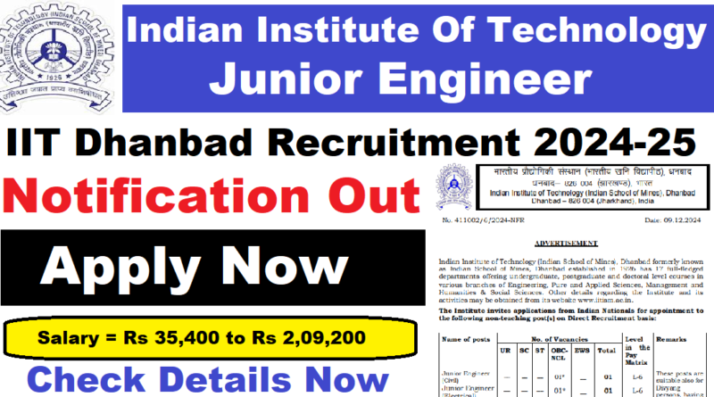 IIT Dhanbad Recruitment 2024-25, Junior Engineer Latest Vacancy 2024-25, 22/01/2025 Last Date