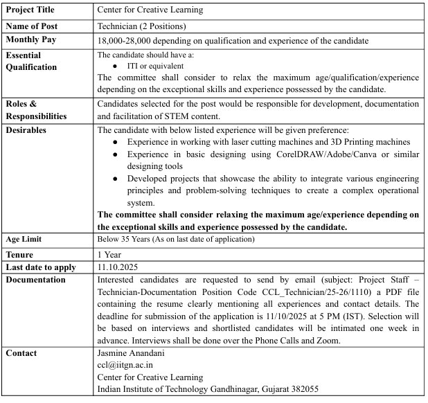 IIT Gandhinagar Recruitment 2025 : Indian Institute of Technology (IIT) Gandhinagar की ओर से 02 Posts पर Recruitment निकली है जिसका Online form शुरू है | IIT Gandhinagar Recruitment 2025 Online form 11/10/2025 तक भरा जायेगा | ITI Pass in various candidates IIT Gandhinagar Recruitment 2025 online form भर सकता है | Interested and eligible candidates IIT Gandhinagar Recruitment 2025 form भर सकते हैं | IIT Gandhinagar Recruitment Full Notification निचे दिया गया हैI IIT Gandhinagar Recruitment Apply Link निचे दिया गया है I