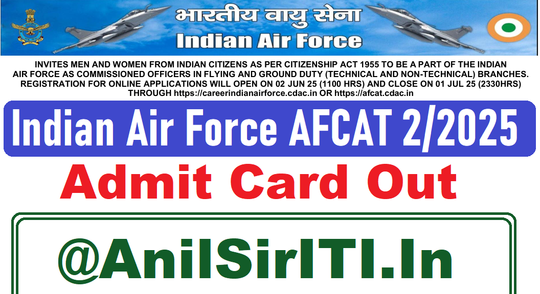 Indian Air Force AFCAT 2/2025 Admit Card Out : Indian Air Force की ओर से 284 Posts पर Recruitment निकली थी जो Candidates AFCAT 2/2025 का Form भरे हुए हैं वे सभी Candidates Indian Air Force AFCAT 2/2025 Admit Card का इंतजार कर रहे हैंI Indian Air Force AFCAT 2/2025 Admit Card को जरी कर दिया गया हैI जिसे Computer Based Test भारत के कई Centre पर आयोजित की जाएगी। अपने Indian Air Force AFCAT 2/2025 Admit Card Download करने के लिए AFCAT 2/2025 Official Website पर जाना होगा और अपने Registration Number/Email ID or Password का उपयोग करके Log In करना होगा। AFCAT 2/2025 Admit Card 2025 Out हो चुकी है |
