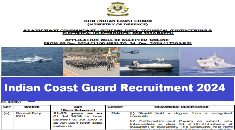 Indian Coast Guard Recruitment 2024 : Indian Coast Guard की ओर से 140 Posts पर Recruitment निकली है जिसका Online form 05/12/2024 से शुरू है | Indian Coast Guard Recruitment 2024 Online form 24/12/2024 तक भरा जायेगा | BE/B.Tech/ Graduate/ Engineering degree in Electrical or Electronics Pass candidates Indian Coast Guard Recruitment 2024 online form भर सकते है | Interested and eligible candidates Indian Coast Guard Recruitment 2024 form भर सकते हैं |Indian Coast Guard Recruitment 2024 की जानकारी निचे दी गई है | Indian Coast Guard Recruitment 2024 Full Notification निचे दिया गया हैI Indian Coast Guard Recruitment 2024 की जानकारी Apply Link निचे दी गई है |