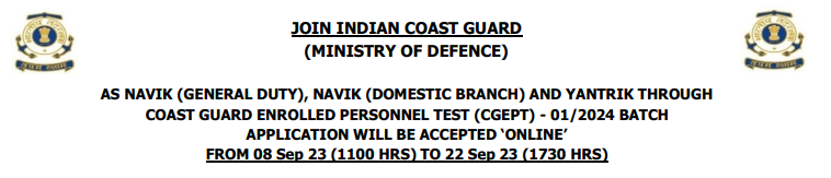 Indian Coast Guard Recruitment 2023 Online form: Online applications are invited from MALE INDIAN CITIZENS possessing educational qualifications and age as prescribed below, for recruitment to the Post of Navik (General Duty), Navik (Domestic Branch) and Yantrikin the Indian Coast Guard, an Armed Force of the Union. Indian Coast Guard Recruitment 2023 Applications for the posts of Navik GD, Navik DB, Yantrik. Indian Coast Guard Recruitment last date for apply online 22 September 2023.