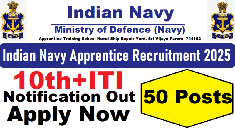 Indian Navy Apprentice Recruitment 2025 : Indian Navy की ओर से 50 Posts पर Recruitment निकली है जिसका Online form 29/07/2025 से शुरू है |Indian Navy Apprentice Recruitment 2025 Online form 18/08/2025 तक भरा जायेगा | 10th+ITI Pass in various candidates Indian Navy Apprentice Recruitment 2025 online form भर सकता है | Interested and eligible candidates Indian Navy Apprentice Recruitment 2025 form भर सकते हैं | Indian Navy Apprentice Recruitment Full Notification निचे दिया गया हैI Indian Navy Apprentice Recruitment Apply Link निचे दिया गया है I