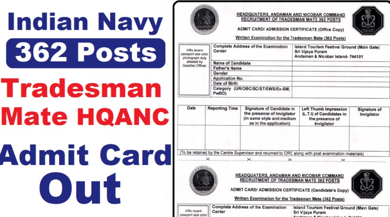 Indian Navy Tradesman Recruitment 2025: Indian Navy की ओर से ITI Pass Candidates के लिए 362 Posts पर Tradesman Mate की recruitment निकली थी | Indian Navy Tradesman Recruitment Online form 26-08-2023 से 25-09-2023 तक भरे गये थे | Indian Navy Headquaters Andaman and Nicobar Command की ओर से Tradesman Mate का online form भरे गये थे | ITI के कई Trade के candidates Indian Navy Tradesman Recruitment 2023 online form भरे थे | Indian Navy Headquarters Andaman and Nicobar Command Recruitment 2023 के लिए 63740 Candidates ने form भरा था | HQANC Recruitment 2023 के form में 2061 Candidates को reject कर दिया गया है | Headquarters Andaman Nicobar Command Recruitment 2023 का Exam 08 and 09 March 2025 को होने वाला है | Indian Navy HQANC Tradesman Mate Recruitment Document Verification 07th March 2025 को होने के बाद Written Exam 08 and 09 March 2025 को होने वाला है |