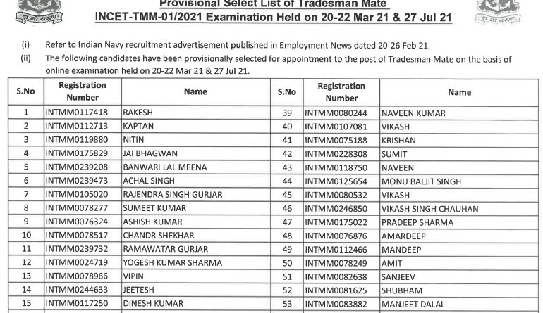 Indian Navy Tradesman Mate Result PDF Download 2021