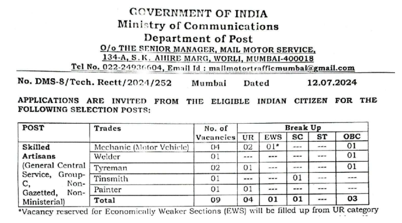 Indian Post Office Recruitment 2024, Skilled Artisans, 10-08-2024 last date