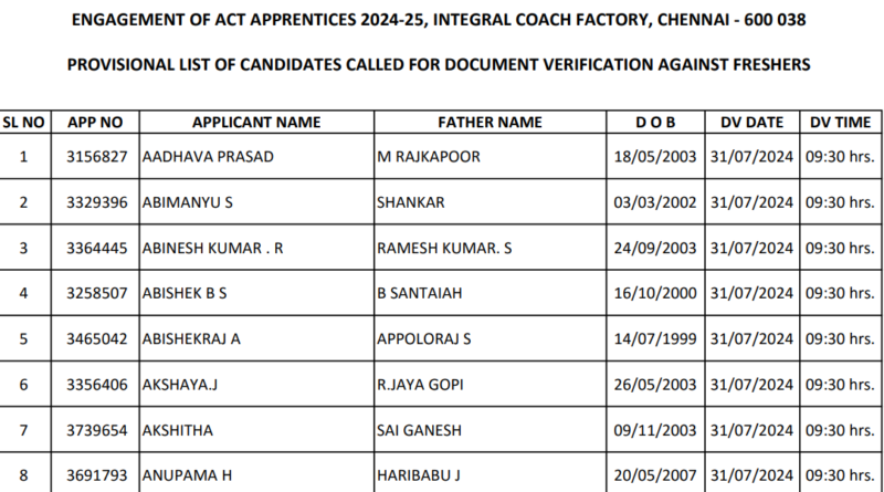 Integral Coach Factory Railway Apprentice 2024-25 Merit list out