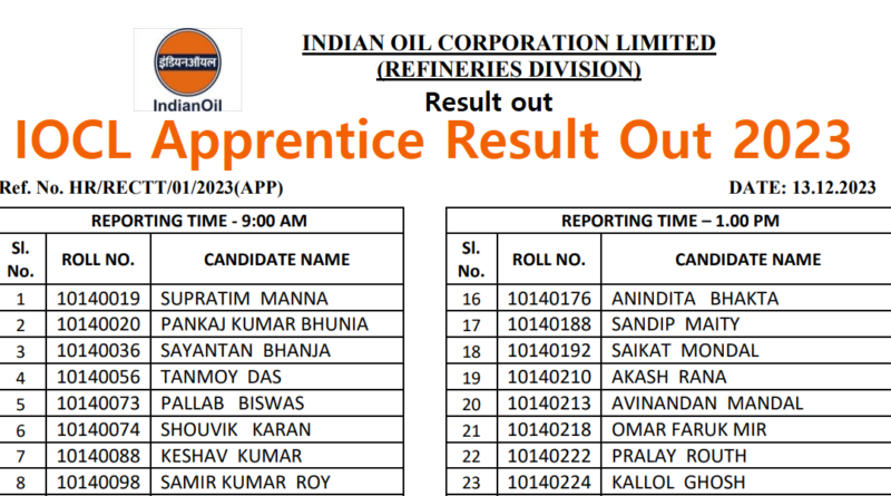 IOCL Apprentice Result 2023, IOCL Refinery Division Apprentice Merit list 2023