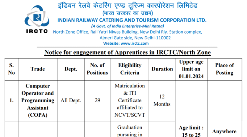 IRCTC Apprentice Recruitment 2024: INDIAN RAILWAY CATERING AND TOURISM CORPORATION LTD (IRCTC Ltd) – A Govt of India Enterprise-Mini Ratna), North Zone invites applications for engagement as Apprentice Trainees under Apprenticeship Act in the trades/ depts as mentioned below . IRCTC Apprentice for ITI and Graduate candidates. IRCTC Apprentice online form apply from 12.02.2024. IRCTC Apprentice online form apply before 27.02.2024.