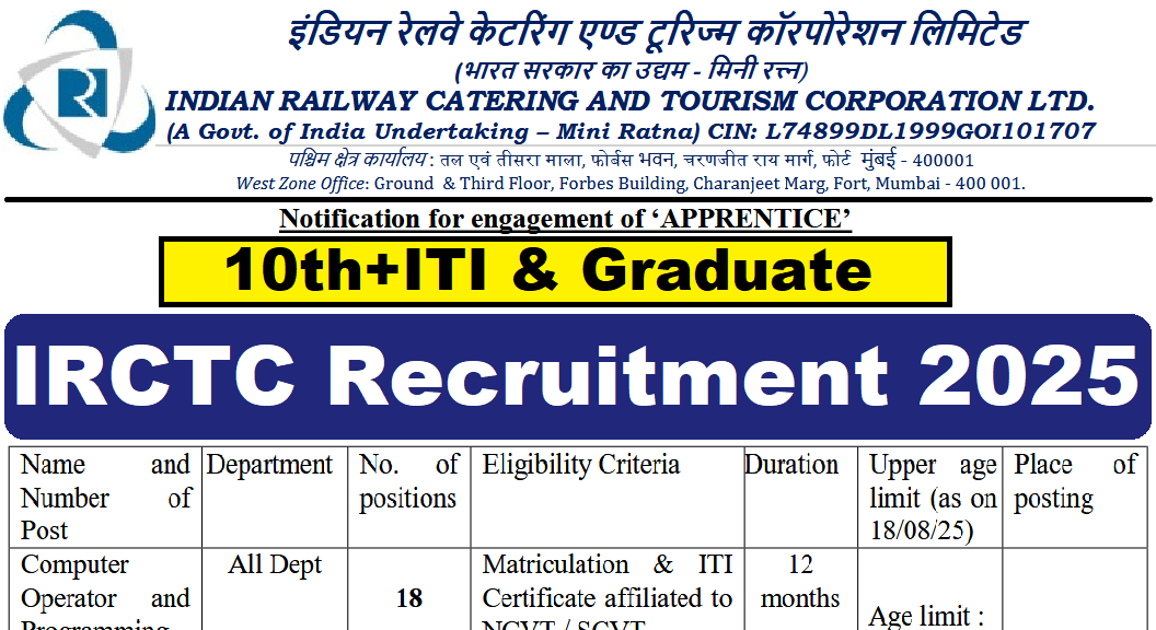 IRCTC Apprentice Recruitment 2025, 10th+ITI & Diploma Pass Latest Vacancy 2025, 02&03 September 2025 Last Date