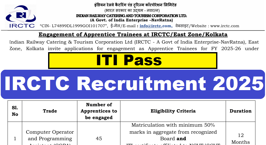 Indian Railway Catering & Tourism Corporation Ltd (IRCTC – A Govt of India Enterprise-NavRatna), East Zone, Kolkata invite applications for engagement as Apprentice Trainees for FY 2025-26 under Apprenticeship Act-1961 (as amended in 2014) as a measures of skill building initiative for the nation as