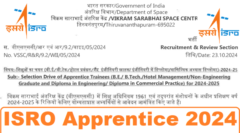 ISRO Apprentice Recruitment 2024-25: ISRO VSSC invites applications for the posts of Apprentice. ISRO VSSC Apprentice Recruitment 2024 for Diploma, BE, B.Tech, etc candidates. ISRO Apprentice 2024 selection through Campus Drive. ISRO VSSC Apprentice 2024 Campus Drive on 28-10-2024. ISRO VSSC Apprentice 2024 Campus Drive at VSSC Guest House, ATF Area, Veli, Near Veli Church, Thiruvananthpuram, Kerala. Candidates who have acquired Degree /Diploma before April 2020 those appearing for final year exam, result awating candidates or candidates pursing ME,MTech are not eligible to apply.