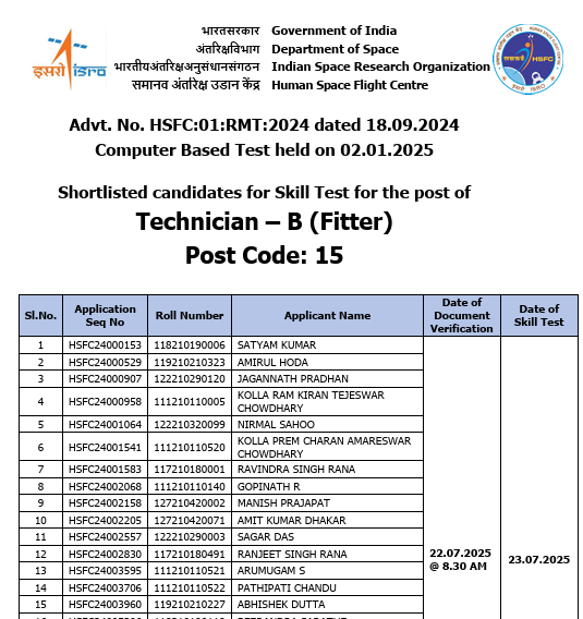 ISRO HSFC Technician B Recruitment Result Sample 2025