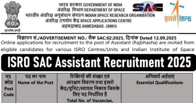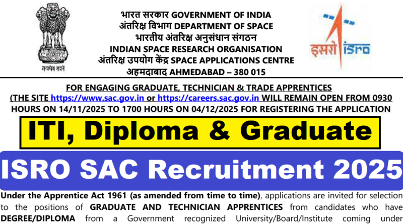 ISRO SAC Recruitment 2025 : Indian Space Research Organization – Space Application Organization (ISRO SAC) की ओर से Apprentice Posts पर Recruitment निकली है जिसका Online form14/11/2025 से शुरू है | ISRO SAC Recruitment 2025Online form 04/12/2025 तक भरा जायेगा |ITI, Diploma & Graduate Pass in various candidates ISRO SAC Recruitment 2025 online form भर सकता है | Interested and eligible candidates ISRO SAC Recruitment 2025 form भर सकते हैं |ISRO SAC Recruitment Full Notification निचे दिया गया हैI ISRO SAC Recruitment Apply Link निचे दिया गया है I
