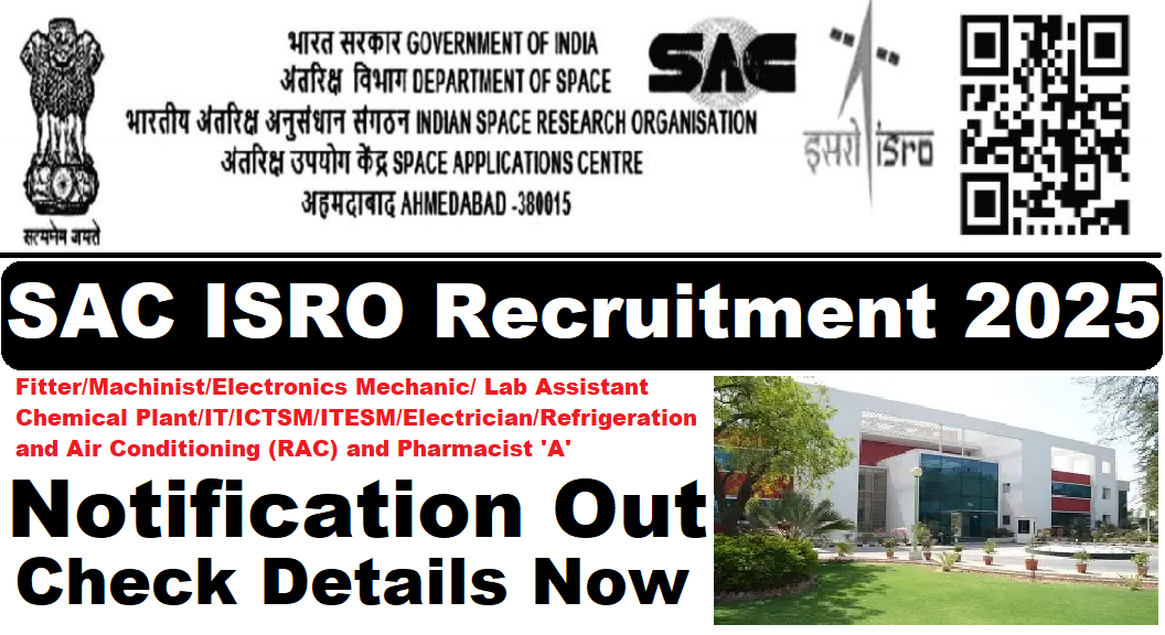 SAC ISRO Recruitment 2025 : Space Application Centre – Indian Space Research Organization (SAC ISRO) की ओर से Fitter/Machinist/Electronics Mechanic/ Lab Assistant Chemical Plant/IT/ICTSM/ITESM/Electrician/Refrigeration and Air Conditioning (RAC) and Pharmacist ‘A’ Posts पर Recruitment निकली है जिसका Online form 24/10/2025 से शुरू है | SAC ISRO Recruitment 2025Online form 13/11/2025 तक भरा जायेगा | ITI, Diploma & Graduate Pass in various candidates SAC ISRO Recruitment 2025 online form भर सकता है | Interested and eligible candidates SAC ISRO Recruitment 2025 form भर सकते हैं | SAC ISRO Recruitment Short Notification निचे दिया गया हैI SAC ISRO Recruitment Apply Link निचे दिया गया है I