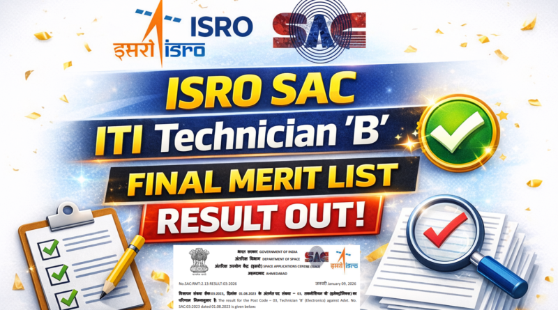 ISRO SAC Technician B Final Result 2026 Out, SAC 03 2023: ISRO SAC (Space Applications Centre) की 01-08-2023 Recruitment का Skill Test Nov 2025 में हुआ था | ISRO SAC Skill Test Technician B Posts के ITI Various Trades के हुए थे जिसका Final List जारी कर दिया गया है | ISRO SAC Final Result list निचे दी गयी है | ISRO SAC Technician Final Result 2026 में Waiting list भी दिया गया है | अगर आप ISRO SAC Skill Test दिए थे तो Final Result जरुर देखें |