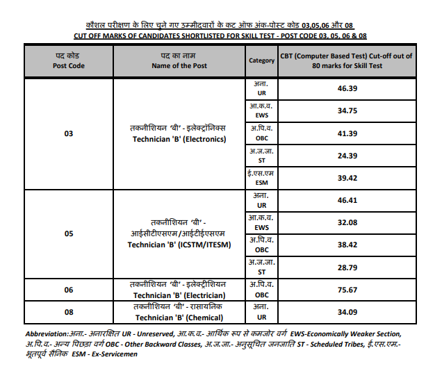 - विज्ञापन संख्या सैक: 03:2023, दिनांक 01.08.2023 के अंतर्गत पद संख्या – 05, तकनीशियन ‘बी’ (आईसीटीएसएम/आईटीईएसएम) का परिणाम निम्नानुसार है: The result for the Post Code – 05, Technician ‘B’ (ICTSM/ITESM) against Advt. No. SAC:03:2023 dated 01.08.2023 is given below: