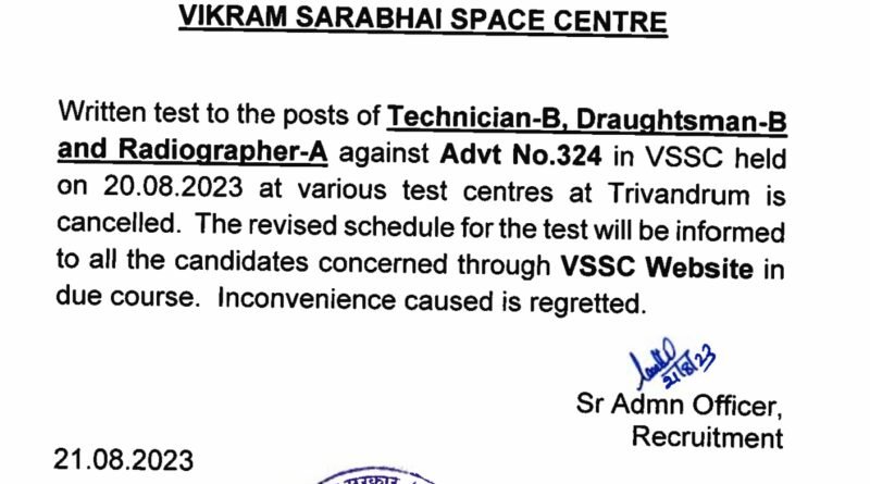 ISRO VSSC Recruitment RMT 324 official notice: ISRO VSSC Notification no. RMT 324 का written Exam 20 August 2023 को हुआ था l ISRO VSSC का Exam के दौरान paper लीक होने के कारण आयोग ने ISRO VSSC Recruitment Exam को cancel कर दिया गया है l