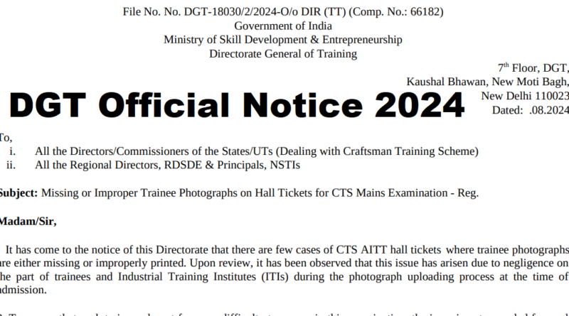 Missing or Improper Trainee Photographs on Hall Tickets for CTS Mains Examination – Reg: It has come to the notice of this Directorate that there are few cases of CTS AITT hall tickets where trainee photographs are either missing or improperly printed. Upon review, it has been observed that this issue has arisen due to negligence on the part of trainees and Industrial Training Institutes (ITIs) during the photograph uploading process at the time of admission.