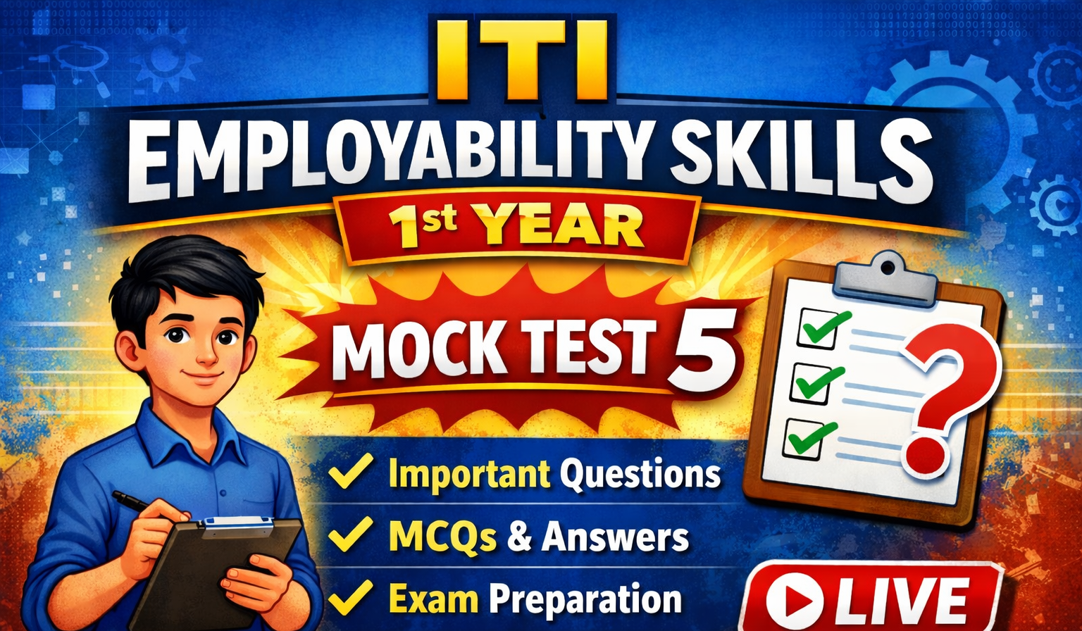 ITI Employability Skills 1st Year Mock Test 5 Live: ITI Employability Skills 1st Year Mock Test 5 Live is a specially curated online practice test designed to boost exam readiness for NCVT CBT aspirants. This live mock test focuses on advanced-level MCQs from communication skills, self-management, IT skills, entrepreneurship, and green skills as per the latest syllabus. By attempting the ITI Employability Skills Mock Test 5 Live, students can experience a real-time exam environment and improve speed and accuracy. The test is ideal for candidates searching for ITI Employability Skills online mock test with answers and instant performance analysis. It helps students identify weak areas and strengthen core concepts effectively. The mock test is available for both Hindi and English medium learners. Regular practice with NCVT Employability Skills live mock tests enhances confidence before the final examination. This test follows the updated NCVT exam pattern and question difficulty level. It is a must-attempt test for serious ITI 1st year students aiming for high scores. Overall, ITI Employability Skills 1st Year Mock Test 5 Live is a reliable and high-quality resource for smart exam preparation.
