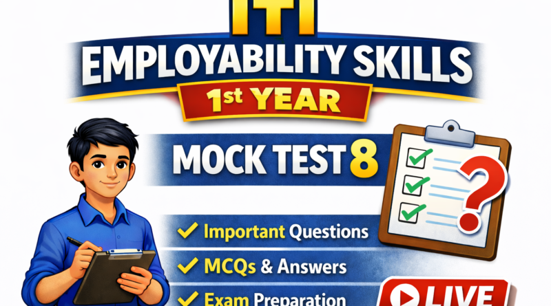 ITI Mock Test ITI Employability Skills 1st Year Mock Test 8 Live Share with your friendsITI Employability Skills 1st Year Mock Test 8 Live:ITI Employability Skills 1st Year – Mock Test 8Lesson: Naming Words – Singular and Plural / नाम शब्द – एकवचन और बहुवचन + Pronouns / सर्वनाम71. Cats is an example of _____ word. A) Words B) Plural C) Singular D) Opposite72. Singular naming words are used when _____ person, place, or thing is present. / एकवचन नाम शब्द तब उपयोग किए जाते हैं जब _____ व्यक्ति, स्थान, या वस्तु मौजूद हो। A) Many / कई B) Few / कुछ C) One / एक D) More / अधिक73. Plural form of child is___. / बच्चे का बहुवचन रूप है ___। A) Person / व्यक्ति B) Infant / शिशु C) Kid / बच्चा D) Children / बच्चे74. A child was working in the computer lab which had many computers. The word “computers” is in the____ form. / एक बच्चा कंप्यूटर लैब में काम कर रहा था जिसमें कई कंप्यूटर थे। “कंप्यूटर्स” शब्द ______ रूप में है। A) Less / कम B) Plural / बहुवचन C) Minimum / न्यूनतम D) Maximum / अधिकतम75. Vinay visited the dentist because he was suffering from tooth ache. Dentist treats our teeth problems. In this sentence, which is the plural word? / विनय दांत दर्द के कारण दंत चिकित्सक के पास गया। दंत चिकित्सक हमारे दांतों की समस्याओं का इलाज करता है। इस वाक्य में कौन सा शब्द बहुवचन है? A) Teeth / दांत B) Tooth / दांत (एकवचन) C) Vinay / विनय D) Dentist / दंत चिकित्सक76. Pronouns (ex: he, she, her) can be used in the place of ________. A) Spellings B) Adjective C) Verb D) Naming words77. ‘They’ is used when we want to refer to _____. / ‘वे’ का उपयोग तब किया जाता है जब हम _____ को संदर्भित करना चाहते हैं। A) He / वह (पुरुष) B) She / वह (स्त्री) C) Many people / कई लोग D) Our / हमारा78. The pronoun “I” is used for ______. A) Many / कई B) Myself / स्वयं C) Other / अन्य D) That / वह79. Ramesh is working in Chennai. ____ likes the office environment. / रमेश चेन्नई में काम कर रहा है। ____ को कार्यालय का माहौल पसंद है। A) He / वह B) It / यह C) That / वह D) What / क्या80. Sita and I are friends. _____ stays in Gandhi Bazar. / सीता और मैं दोस्त हैं। _____ गांधी बाजार में रहती है। A) What / क्या B) She / वह C) A / एक D) And / औरSubmit Quiz Join UsDownload App
