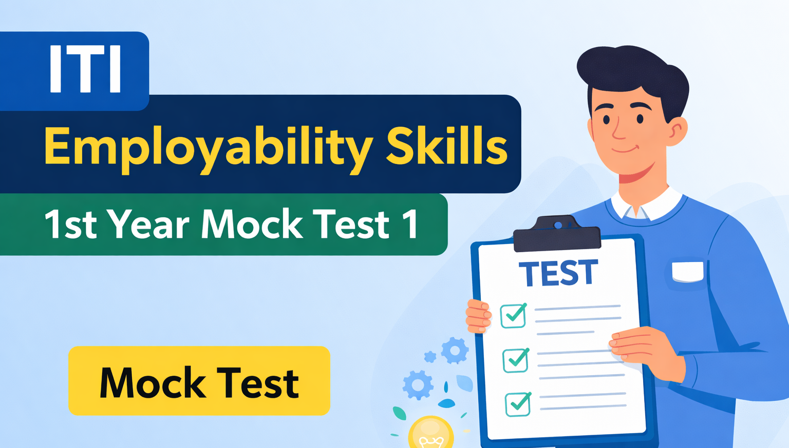 ITI Employability Skills 1st Year Mock Test: ITI Employability Skills 1st Year Mock Test is specially designed to help ITI students prepare effectively for the NCVT CBT examination. This online mock test covers all important topics of Employability Skills such as communication skills, self-management, information technology, entrepreneurship, and green skills. By attempting the ITI Employability Skills online mock test, students can practice real exam–level MCQs and understand the latest exam pattern. The mock test improves speed, accuracy, and confidence before the final examination. It is ideal for candidates searching for ITI Employability Skills mock test with answers and detailed solutions. Students can attempt the ITI Employability Skills CBT practice test multiple times for better revision. This mock test is useful for both Hindi and English medium candidates. Regular practice with NCVT Employability Skills mock tests helps in scoring higher marks. The test is fully aligned with the latest NCVT syllabus for 1st year ITI students. Overall, the ITI Employability Skills 1st Year Mock Test is the best online tool for exam preparation and success.