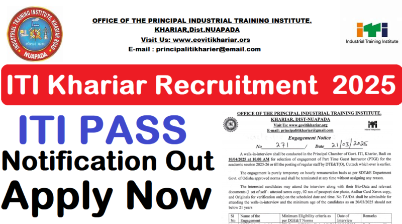 ITI Khariar Recruitment 2025 : Industrial Training Institute Khariar की ओर से PTGI (Mechanic Motor Vehicle) (M.M.V) Post पर Walk-In-Interview निकली है जिसका Interview Date 10 April 2025 , सुबह 09:00 बजे है|ITI Pass in various candidates Offline Walk-In-Interview में शामिल हो सकते हैI आपकी CV/Biodata को address : Principal Govt. ITI, Khariar Badi, AtlPo- Raj Khariar Dist- Nuapada, Pin-766107 पर Speed send करेI ITI Khariar Walk-In-Interview 2025 Full Notification निचे दिया गया है |