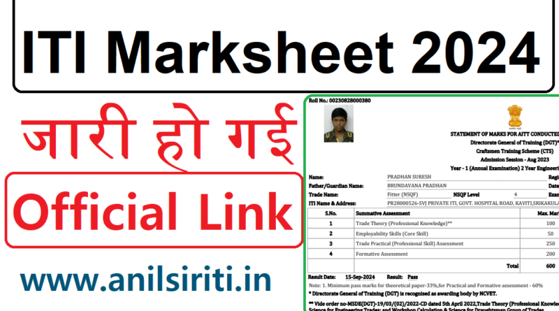 ITI Original Marksheet Download 2024: ITI Exam August 2024 में होने के बाद 15 September 2024 को Result आने के बाद सभी Original Marksheet का इंतजार कर रहे हैं | ITI Original Marksheet kab ayega सभी के मन में यही सवाल है | ITI Original Marksheet 23 September 2024 तक जारी होने वाला है | ITI Original Marksheet 2024 skillindiaportal.gov.in पर जारी होगा | ITI Marksheet Download 2024 link निचे दी गई है | ITI Pass सभी candidates ITI Skill India Marksheet Download कर सकते हैं | ITI Skill India Marksheet Download Link 2024 निचे दी गई है | ITI Marksheet Download 2024 Process Anil Sir ITI YouTube Channel पर उपलब्ध है |
