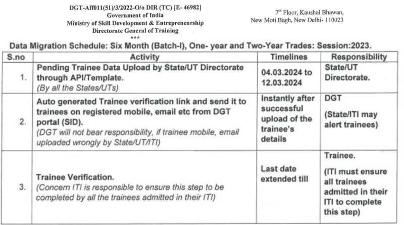 | Trainee Verification. (Concem 171 is responsible to ensure this step to be completed by all the trainees admitted in their ITI) | Last date extended till 31 May2024 | Trainee. (ITI must ensure all trainees admitted in their ITI to complete this step) |