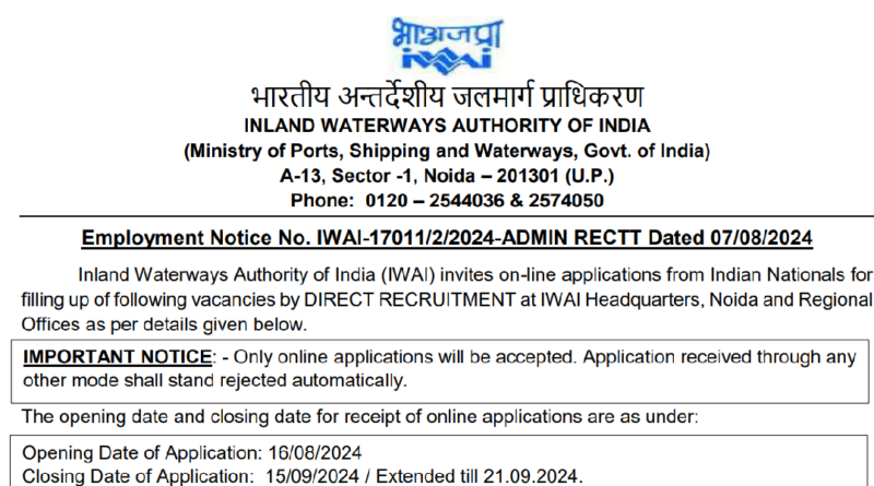 IWAI Various Posts Recruitment 2024, 21-09-2024 last dates