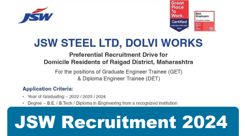 JSW Steel Recruitment 2024: JSW Steel Ltd Dolvi Works invite application for the posts of Graduate Engineer Trainee & Diploma Engineer Trainee. JSW Steel Recruitment 2024 for Diploma,BE, BTech Candidates. JSW Steel Recruitment 2024 Online form apply from 05-11-2024. JSW Steel Recruitment 2024 Online form apply before 26-11-2024. JSW Recruitment 2024 Online form and Notification link given below.