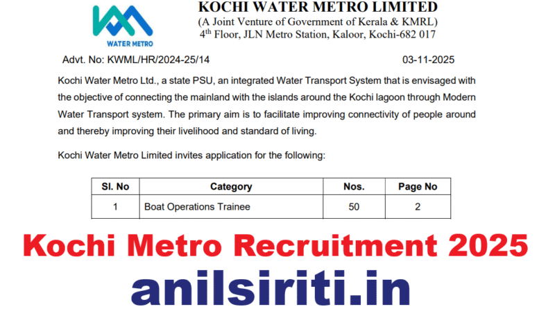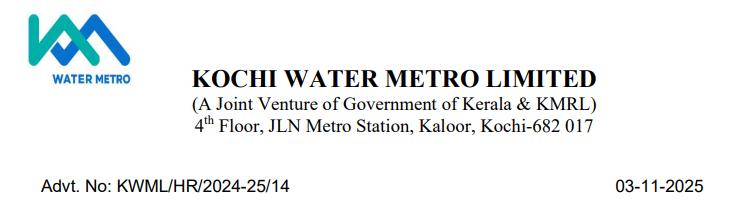 Kochi Water Metro Recruitment 2025: Kochi Water Metro Ltd., a state PSU, an integrated Water Transport System that is envisaged with the objective of connecting the mainland with the islands around the Kochi lagoon through Modern Water Transport system. The primary aim is to facilitate improving connectivity of people around and thereby improving their livelihood and standard of living. Kochi Water Metro Recruitment 2025 for ITI, Diploma various qualification candidates. Kochi Water Metro Recruitment 2025 for Boat Operations Trainee, Consultant (Civil) ,Marketing Executive etc posts. Kochi Water Metro Recruitment 2025 apply before 20 Nov 2025.