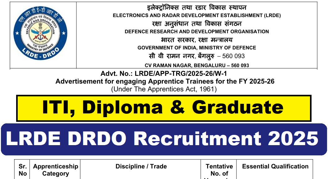 LRDE DRDO Recruitment 2025 : DRDO – Electronics and Radar Development Establishment (LRDE)की ओर से 105 Posts पर Recruitment निकली है जिसका Registration form शुरू है | LRDE DRDO Recruitment walk-in interview 04th November 2025 (Tuesday) को किया जाएगा | ITI, Diploma & Graduate Pass candidates LRDE DRDO Recruitment 2025 offline form भर सकता है | Interested and eligible candidates LRDE DRDO Recruitment 2025 form भर सकते हैं | LRDE DRDO Recruitment Full Notification निचे दिया गया हैI LRDE DRDO Recruitment Date, Time & Venue निचे दिया गया है I