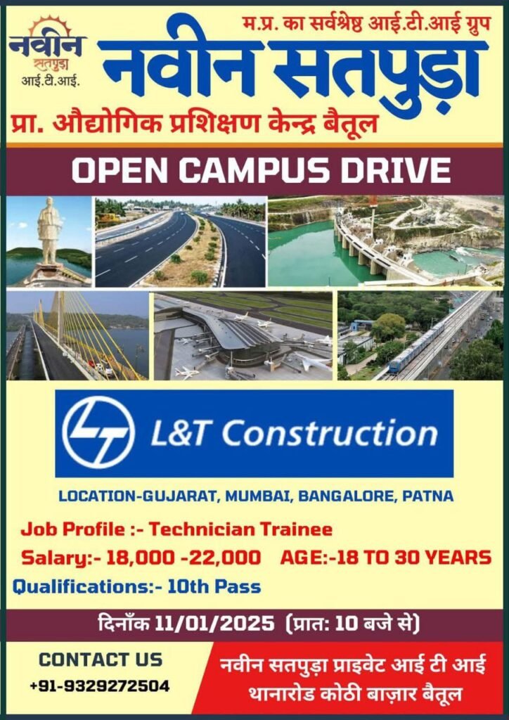 L&T Construction Technician Recruitment 2024 : L&T Construction की ओर से Technician Trainee Posts पर Open Campus Placement निकली है जिसका Interview Date :11 January 2025 को सुबह 10 बजे रहने वाला है|10th Pass candidates L&T Construction Technician Recruitment 2024 में शामिल हो सकते हैI आपकी Campus Placement Locations :- Navin Satpuda Privet I.T.I Thanaroad Kothi Bazar Baitool रहने वाला हैI L&T Construction Recruitment 2024 Full Notification निचे दिया गया है |