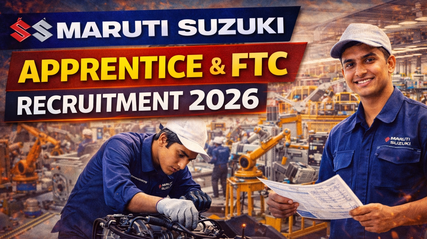 Maruti Suzuki Apprentice and FTC Recruitment 2026: Excellent Career Opportunity for ITI Pass-out Students, in India’s No. 1 Passenger Car Manufacturing Company. Maruti Suzuki Gujarat Plant invite application and campus placement for ITI Pass candidates. ITI Pass Motor Mechanic, Diesel Mechanic, Tractor Mechanic, Machinist, Electrician, Fitter, Turner, Welder, Painter, Wireman, Sheet Metal, COE (Automobile), Electronic Mechanic, Tool & Die, PPO trades candidates are eligible for Maruti Suzuki Apprentice and FTC Recruitment 2026. Eligible and intrested candidates can visit nearest campus placement of Maruti Suzuki Gujarat Plant.
