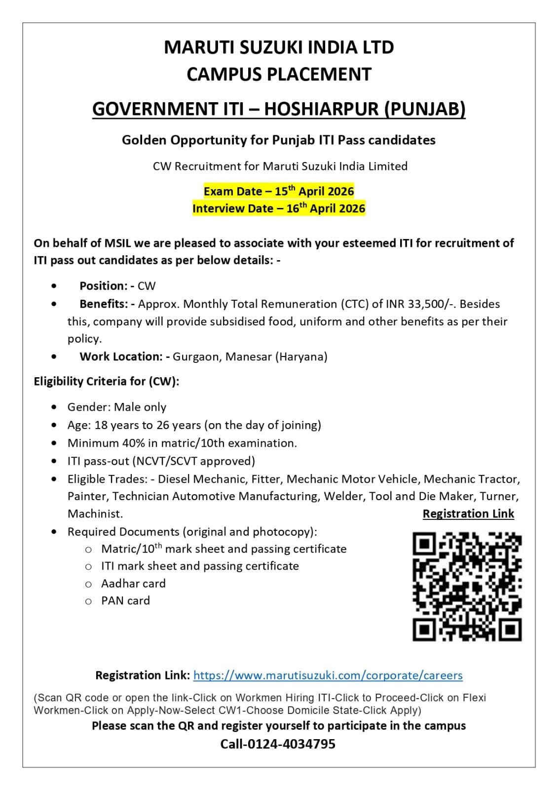 Maruti Suzuki CW Recruitment 2026: Maruti Suzuki India Limited (MSIL) की ओर से Government ITI, Hoshiarpur (Punjab) में CW (Contract Worker) Position के लिए Campus Placement का आयोजन किया जा रहा है। यह Punjab के ITI Pass candidates के लिए एक Golden Opportunity है। Exam 15 April 2026 और Interview 16 April 2026 को होगा। Work Location Gurgaon / Manesar, Haryana होगी।
