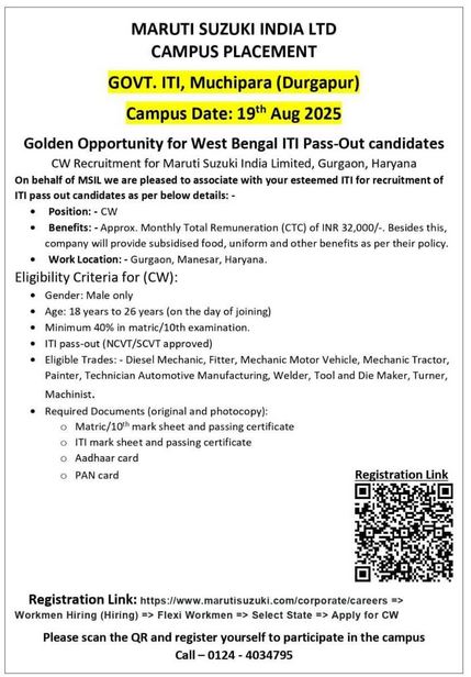 Maruti Suzuki Recruitment 2025 : Maruti Suzuki India Limited की ओर से Diesel Mechanic, Fitter, Mechanic Motor Vehicle, Mechanic Tractor, Painter, Technician Automotive Manufacturing, Welder, Tool and Die Maker, Turner, Machinist Post पर Campus Placement निकली है जिसका Campus Date 09 July 2025, Interview Date 19 August 2025 , सुबह 08:30 बजे है|ITI Pass in various candidates Offline Campus Placement में शामिल हो सकते हैI आपकी Campus Placement Location – Government ITI Muchipara (Durgapur) रहने वाला हैI Maruti Suzuki Campus Placement 2025 Full Notification निचे दिया गया है | Maruti Suzuki CW Campus Drive 2025 सिर्फ West Bengal छात्रों के लिए ही हैं |