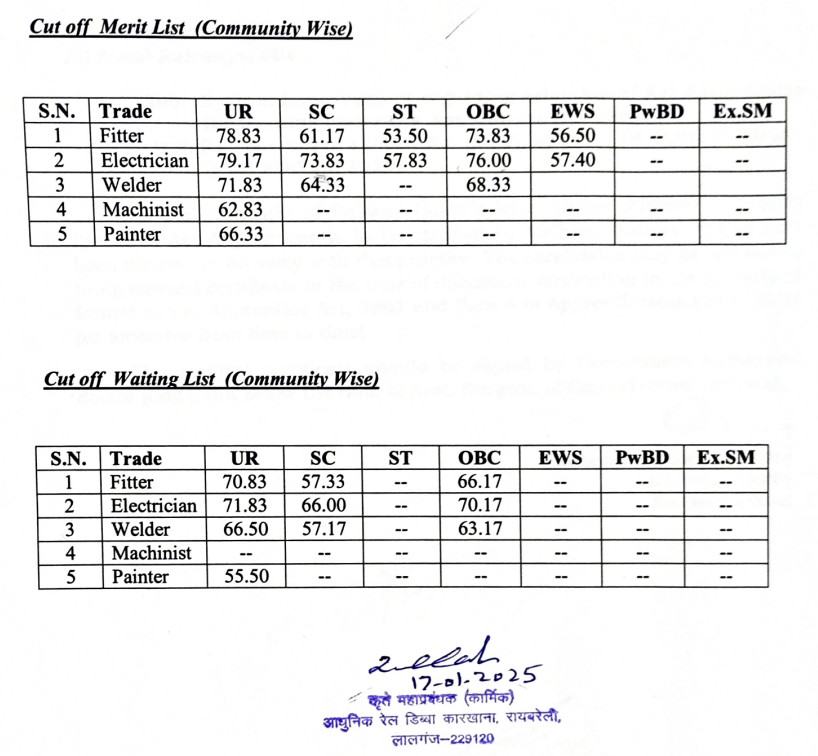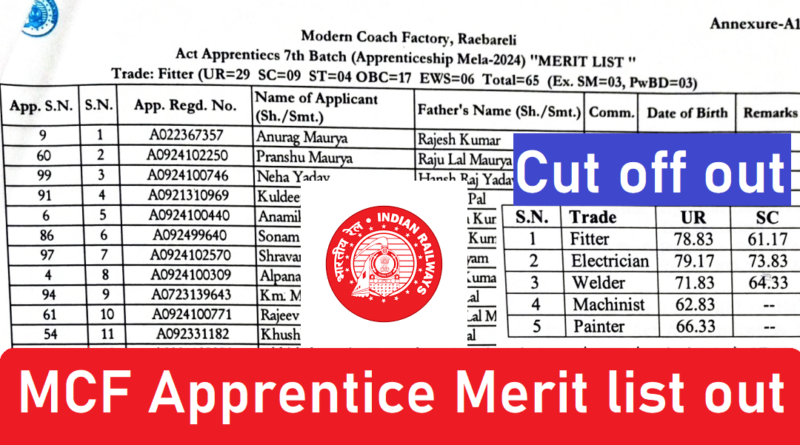 MCF Railway Apprentice Merit list 2025, MCF Raebareli Apprentice Cut off 2025