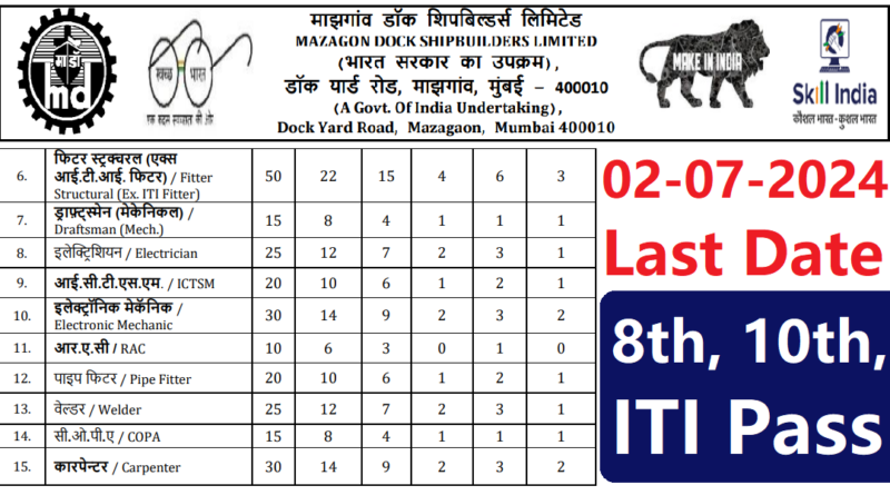 Mazagon Dock Shipbuilders limited Apprentice 2024: MDL की ओर से 8th, 10th, ITI Pass candidates के लिए Apprentice निकली है जिसका online form भरना शुरू हो चूका है। MDL Apprentice online form 12-06-2024 से 02-07-2024 तक भरा जाएगा। ITI Pass Fitter, Draftsman Mechnaical, Electrician, ICTSM, Electronic Mechanic, RAC, Pipe Fitter, Welder, COPA, Carpenter trades candidates MDL Apprentice के लिए eligible है |