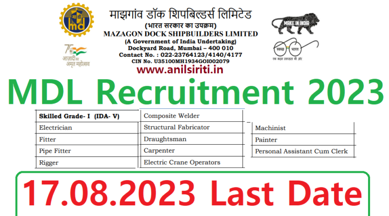 Mazagon Dock Shipbuilders Limited Recruitment 2023: MDL Mumbai की ओर से ITI Pass candidates के लिए Apprentice निकली है जिसका Online form भरना शुरू हो चूका है | MDL Non Executive Recruitment Online form 17-08-2023 तक भरा जायेगा | MDL Non Executive Permanent Recruitment के लिए Electrician, Fitter, Pipe Fitter, Rigger, Composite Welder, Structural Fabricator, Draughtsman, Carpenter, Electric Crane Operators, Machinist, Painter, Personal Assistant Cum Clerk Posts पर online form भर सकते हैं |
