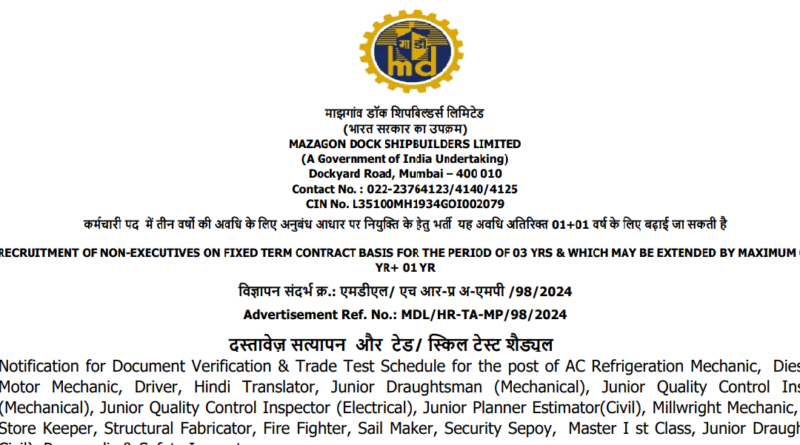 - Notification for Document Verification & Trade Test Schedule for the post of AC Refrigeration Mechanic, Diesel Cum Motor Mechanic, Driver, Hindi Translator, Junior Draughtsman (Mechanical), Junior Quality Control Inspector (Mechanical), Junior Quality Control Inspector (Electrical), Junior Planner Estimator(Civil), Millwright Mechanic, Rigger, Store Keeper, Structural Fabricator, Fire Fighter, Sail Maker, Security Sepoy, Master I st Class, Junior Draughtsman( Civil), Paramedic & Safety Inspector.