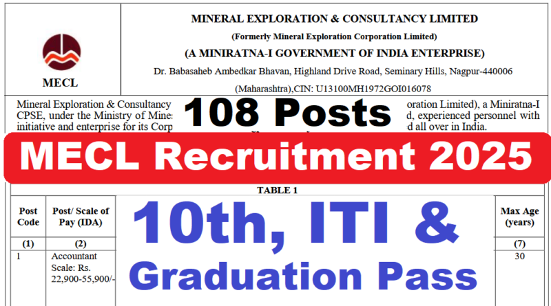 MECL Non- Executive Recruitment 2025 : Mineral Exploration & Consultancy Limited (MECL) की ओर से 108 Posts पर Recruitment निकली है जिसका Online form 14/06/2025 से शुरू है | MECL Recruitment 2025 Online form 05/07/2025 तक भरा जायेगा |10th, ITI & Graduation Pass in various candidates MECL Recruitment 2025 online form भर सकता है | Interested and eligible candidates MECL Recruitment 2025 form भर सकते हैं | MECL Recruitment Full Notification निचे दिया गया हैI MECL Recruitment Apply Link निचे दिया गया है I