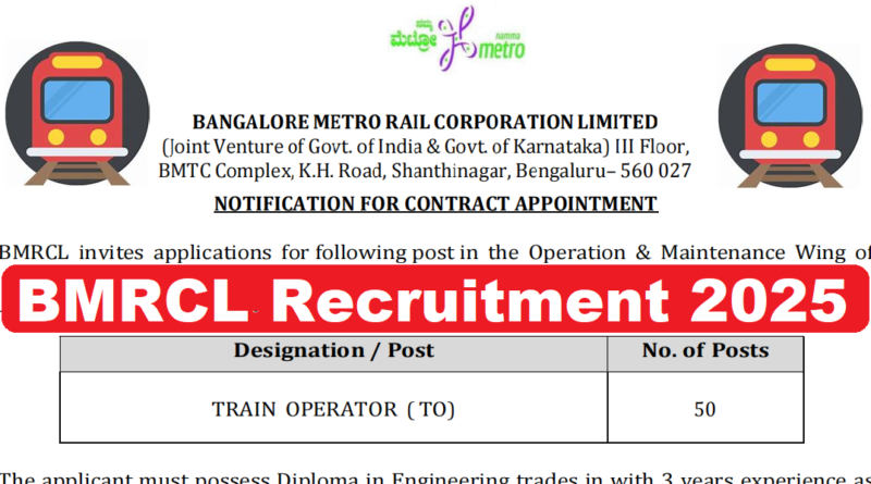 BMRCL Recruitment 2025 : Bangalore Metro Rail Corporation Limited (BMRCL) की ओर से 50 Posts पर Recruitment निकली है जिसका Offline form 12/03/2025 से शुरू है | BMRCL Recruitment 2025 Offline form 04/04/2025 तक भरा जायेगा |10th + Diploma Pass in various candidates BMRCL Recruitment 2025 offline form भर सकता है | Interested and eligible candidates BMRCL Recruitment form भर सकते हैं |BMRCL Recruitment Full Notification निचे दिया गया हैI BMRCL Recruitment 2025 Apply Link निचे दिया गया है I