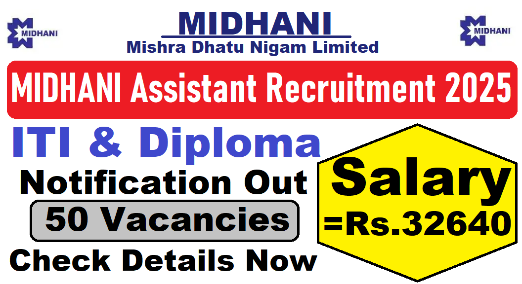 MIDHANI Assistant Recruitment 2025 : Mishra Dhatu Nigam Limited (MIDHANI) की ओर से Assistant Post पर Walk-In-Interview निकली है जिसका Interview Date 08/09/2025 to 17/09/2025 , सुबह 08:00 बजे है|ITI & Diploma Pass in various candidates Offline Walk-In-Interview में शामिल हो सकते हैI आपकी Walk-In-Interview Location – Midhani Corporate Office Autitorium, Hyderabad रहने वाला हैI MIDHANI Assistant Walk-In-Interview 2025 Full Notification निचे दिया गया है |