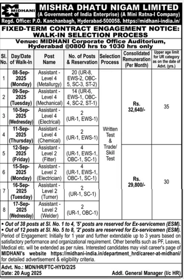 MIDHANI Assistant Recruitment Qualification 2025 Sl. No. Day / Date Post Name No. of Posts & Reservation Selection Process Consolidated Remuneration (Per Month) Qualification Upper Age Limit (UR) 1 08-Sep-2025 (Mon) Assistant – Level 4 (Metallurgy) 20 (UR-8, EWS-2, OBC-5, SC-3, ST-2) Written Test & Trade/Skill Test ₹32,640/- Diploma in Metallurgical Engg. with minimum 60% marks 35 yrs 2 09-Sep-2025 (Tue) Assistant – Level 4 (Mechanical) 14 (UR-6, EWS-1, OBC-4, SC-2, ST-1) Written Test & Trade/Skill Test ₹32,640/- Diploma in Mechanical Engg. with minimum 60% marks 35 yrs 3 10-Sep-2025 (Wed) Assistant – Level 4 (Electrical) 2 (UR-1, EWS-1) Written Test & Trade/Skill Test ₹32,640/- Diploma in Electrical Engg. with minimum 60% marks 35 yrs 4 11-Sep-2025 (Thu) Assistant – Level 4 (Chemical) 2 (UR-1, EWS-1) Written Test & Trade/Skill Test ₹32,640/- B.Sc (Chemistry) min 60% marks or Diploma in Chemical Engg. min 60% marks 35 yrs 5 12-Sep-2025 (Fri) Assistant – Level 2 (Fitter) 4 (UR-1, EWS-1, OBC-1, SC-1) Written Test & Trade/Skill Test ₹29,800/- SSC + ITI (Fitter) + NAC 30 yrs 6 15-Sep-2025 (Mon) Assistant – Level 2 (Electrician) 4 (UR-1, EWS-1, OBC-1, SC-1) Written Test & Trade/Skill Test ₹29,800/- SSC + ITI (Electrician) + NAC 30 yrs 7 16-Sep-2025 (Tue) Assistant – Level 2 (Turner) 2 (UR-1, SC-1) Written Test & Trade/Skill Test ₹29,800/- SSC + ITI (Turner) + NAC 30 yrs 8 17-Sep-2025 (Wed) Assistant – Level 2 (Welder) 2 (UR-1, OBC-1) Written Test & Trade/Skill Test ₹29,800/- SSC + ITI (Welder) + NAC 30 yrs