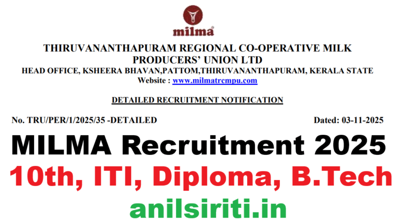 MILMA Recruitment 2025: The Thiruvananthapuram Regional Co-operative Milk Producers’ Union Ltd. (TRCMPU Ltd.), affiliated to the Kerala Co-operative Milk Marketing Federation Ltd. popularly known as MILMA, is a professionally managed Co-operative organisation with a distinguished legacy of over four decades. Formed as part of the world-famous Operation Flood project, TRCMPU Ltd. stands as one of the significant Dairy Co-operatives in the state of Kerala. MILMA Recruitment 2025 Online form apply before 27-11-2025. MILMA Recruitment 2025 Notification and Apply link given below:-