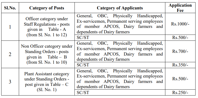 - The selection of candidates to the invited posts (Table-A, Table-B & Table-C) will be done through Written Test/Skill Test/ Group Discussion and Interview as applicable for each post. The Job Description, Syllabus for Written Test, Recognition of academic qualifications, Format of experience certificate, Format of Employment certificate to be issued by the concerned authorities of APCOS affiliated to TRCMPU Ltd. in the case of APCOS employees, Certificate to be issued by the concerned authorities of APCOS affiliated to TRCMPU Ltd. in the case of Dairy farmers and their dependents are published along with this Recruitment Notification.